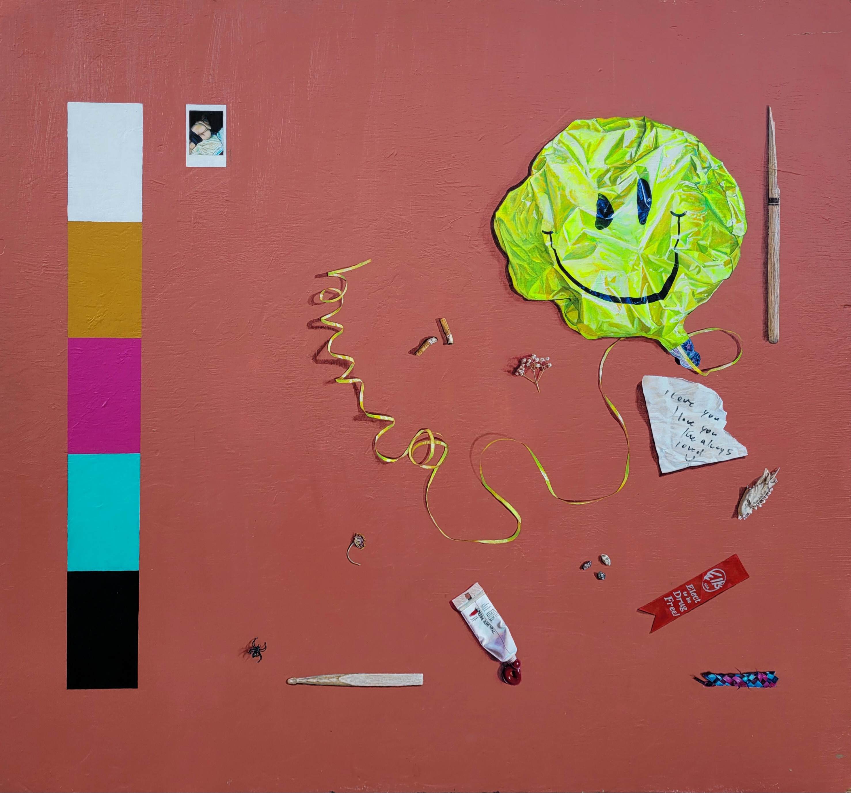 She uses recycled canvas and found surfaces whose prior wear becomes part of the narrative. Referencing consumerism, the saved photos on her phone, and graphic design, Jones builds compositions that balance precision with playful unruliness, often threading humor or irony through themes of nostalgia, late-stage capitalism, and longing.
